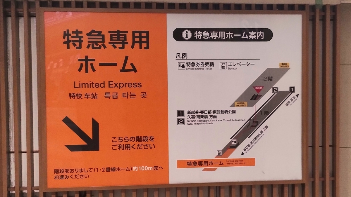 - 東武線特急のりばは1階ホームの1番線北端にある