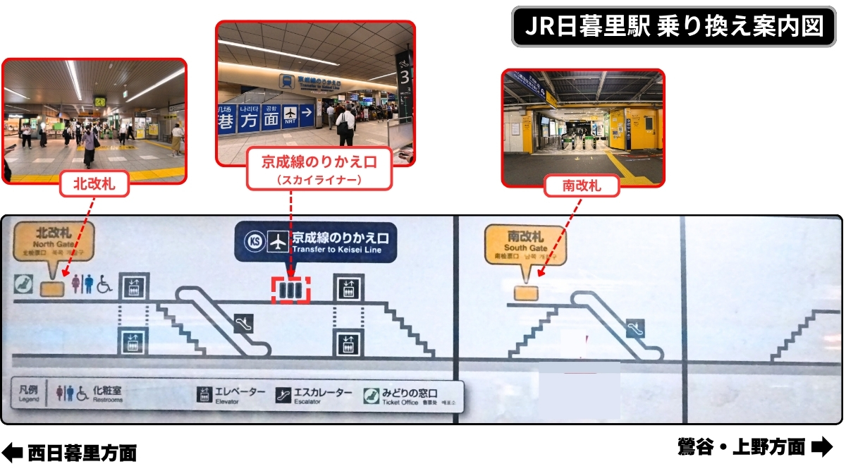 • 日暮里駅の改札口の位置と京成線のりかえ口の場所