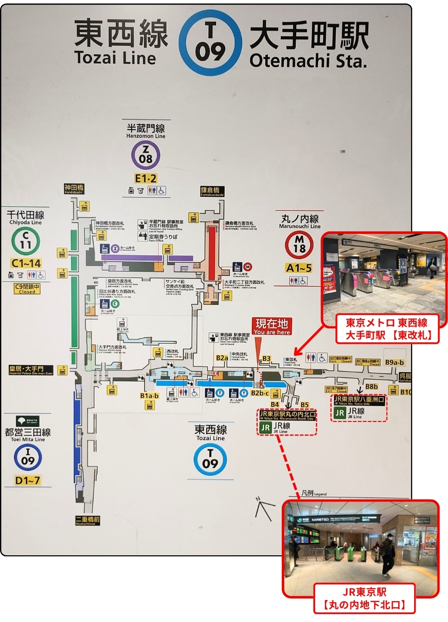 - 東西線大手町駅「東改札」からJR東京駅「丸の内地下北口改札」までは徒歩約3分40秒で最短ルート