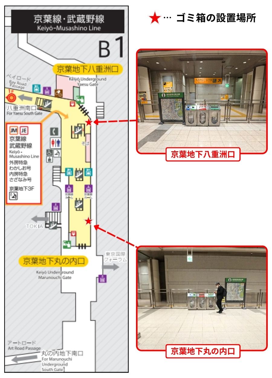 - 京葉線は地下2階に改札があり、京葉地下丸の内口と京葉地下八重洲口の両方にゴミ箱がある