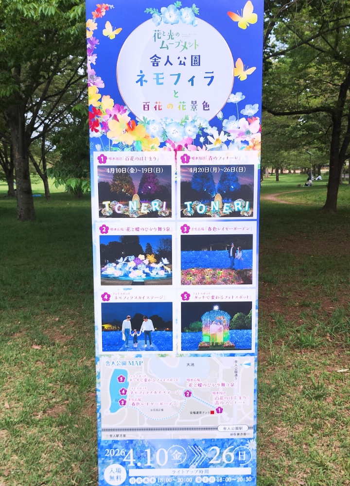 2026年は「花と光のムーブメント 舎人公園~ネモフィラと百花の花景色~」と題した特別イベントが開催。