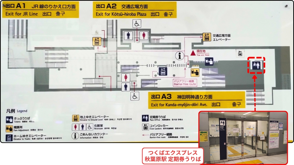 つくばエクスプレス(TX)秋葉原駅改札から定期券売り場への行き方|駅構内図をもとに写真解説
